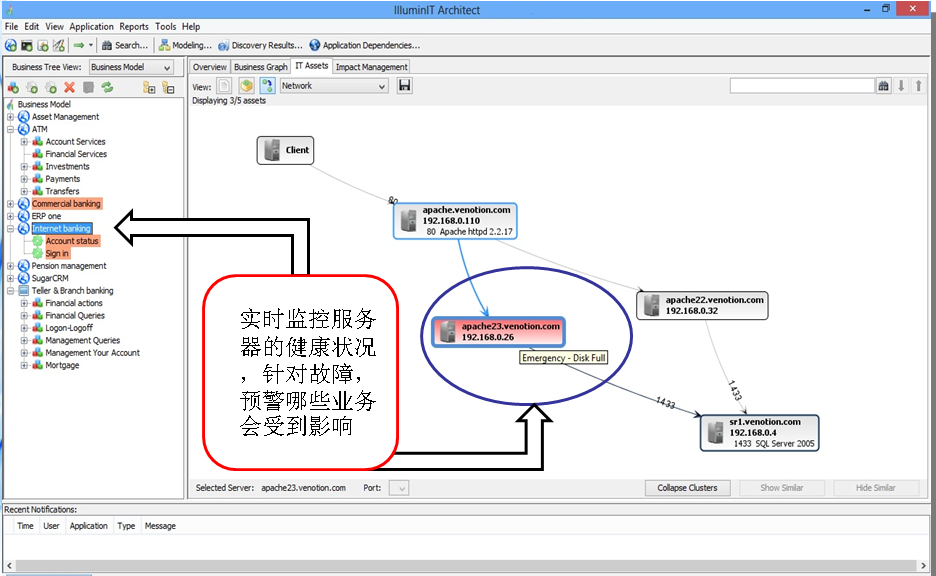 VNT公司的IlluminIT™产品自动发现并映射出每一个业务应用是如何流转并利用IT基础设施的,使您能够从业务视角来进行IT 管理。IlluminIT 通过一个清晰的图像呈现出了各种服务器如何影响业务应用,以此促进了有效规划,并且能够监视事件对业务的影响,即时地对变更进行模拟与审计。