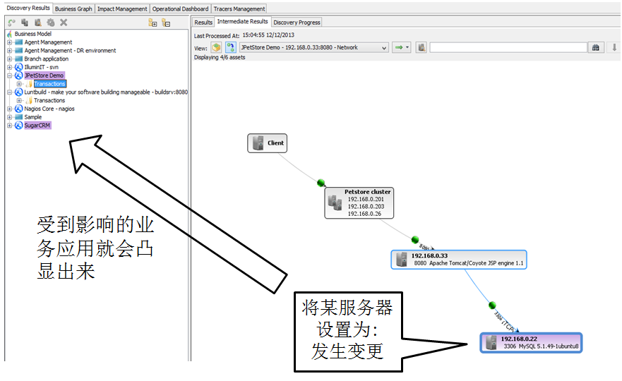 07:可以模拟变更产生的影响,通过将服务器加入变更影响组(impact set),受影响的业务就会显示出来